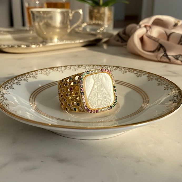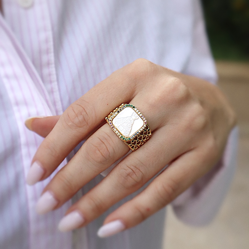 O Anel Nossa Senhora Aparecida une fé, proteção e sofisticação em um design atemporal. No centro, a imagem da Santa em madrepérola reflete delicadeza e pureza, enquanto as laterais cravejadas em zircônias intensificam o brilho e tornam a peça ainda mais especial. Mais que um anel, é um símbolo de devoção transformado em joia, perfeito para ser usado todos os dias ou em momentos especiais.