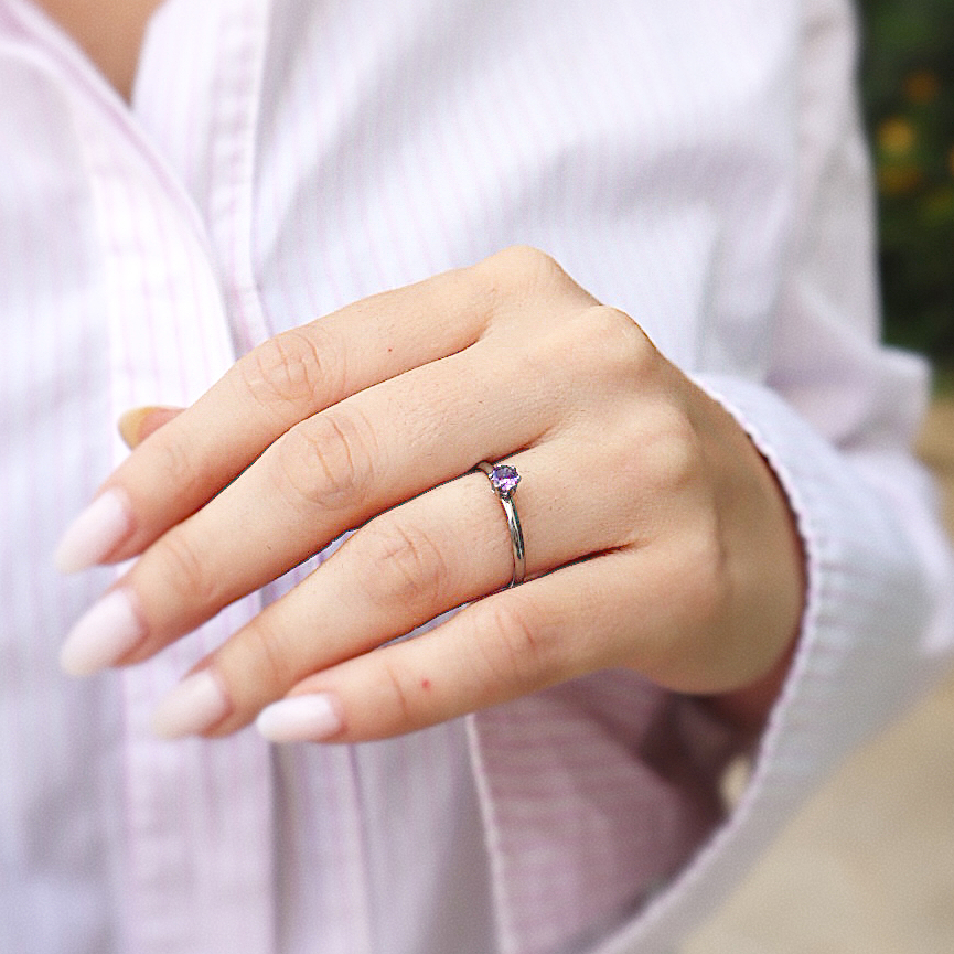 Com design minimalista e elegante, o Anel Ponto de Luz Lavanda é a definição de delicadeza atemporal. A pedra central em tom lavanda ilumina as mãos com suavidade, trazendo um toque de cor sutil e sofisticado ao visual.