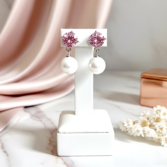 O Brinco Bella combina pedra principal rosa e pérola clássica, traduzindo feminilidade, sofisticação e suavidade. Seu design elegante valoriza o rosto e adiciona um toque romântico e atemporal ao look.