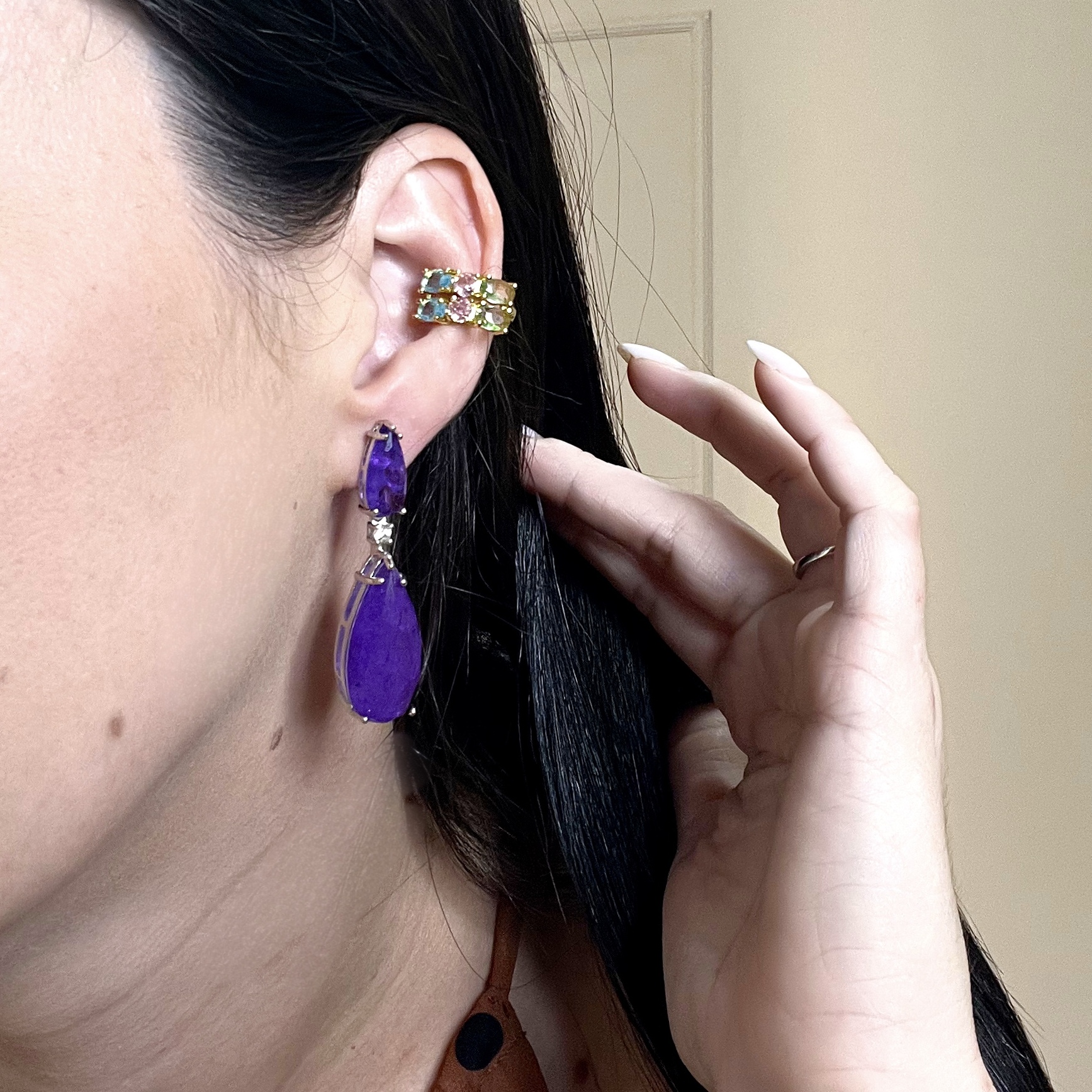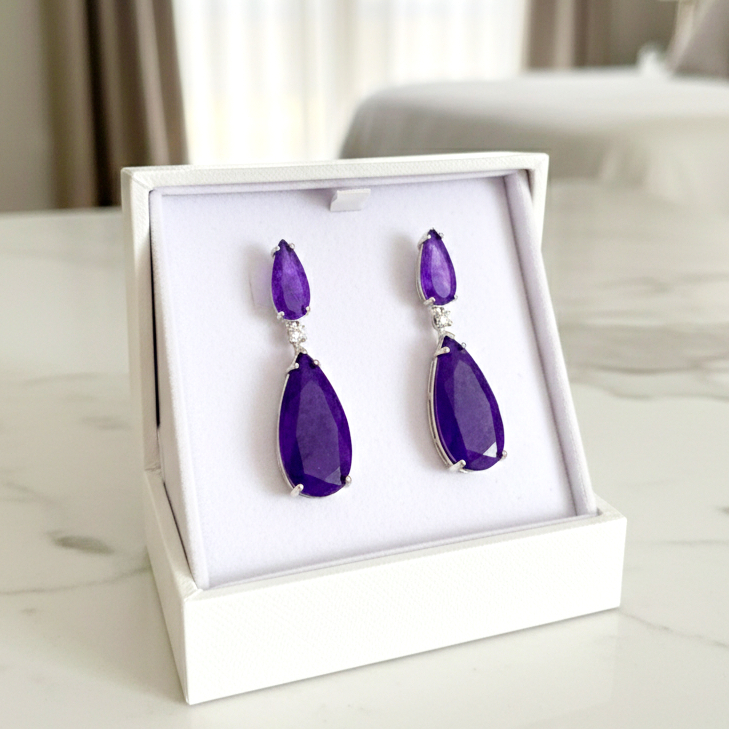O Brinco Royalle Purple com banho em ródio branco é a definição de elegância contemporânea. O contraste entre o tom purple intenso e o brilho frio do ródio cria uma joia refinada, moderna e extremamente sofisticada.