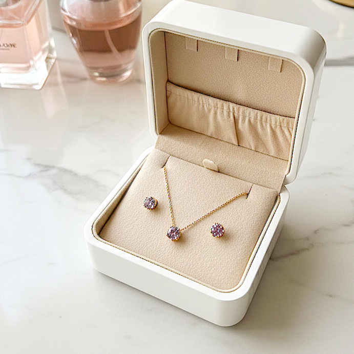 Conjunto Beatrice Lavanda – brilho clássico em tom suave ✨