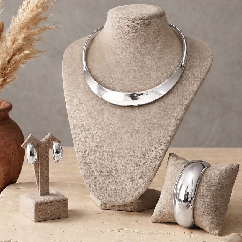 O Kit Cleopatra em ródio branco — composto por colar, pulseira e brincos — traz um brilho moderno e refinado, perfeito para quem busca presença com delicadeza. Seu design marcante ganha ainda mais destaque no acabamento prateado, criando um visual elegante e imponente na medida certa.