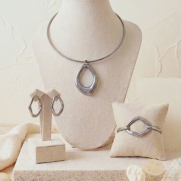Com um design orgânico e acabamento impecável, o Kit Orleans em ródio branco — composto por choker, bracelet e brincos — traduz elegância minimalista com um brilho moderno e refinado. Sem pedrarias, sua beleza está nas formas fluidas que refletem luz de maneira sutil e sofisticada.