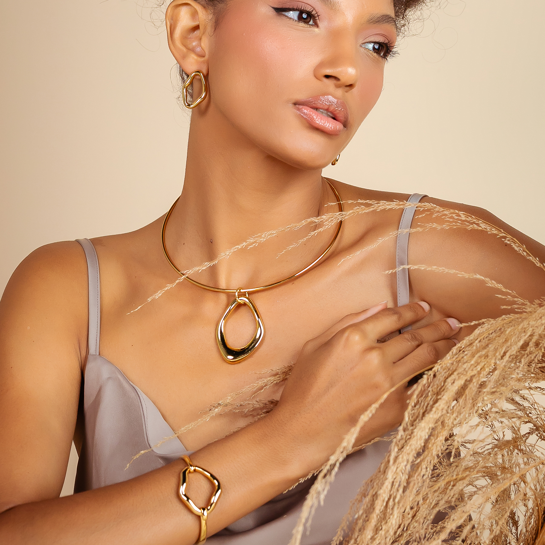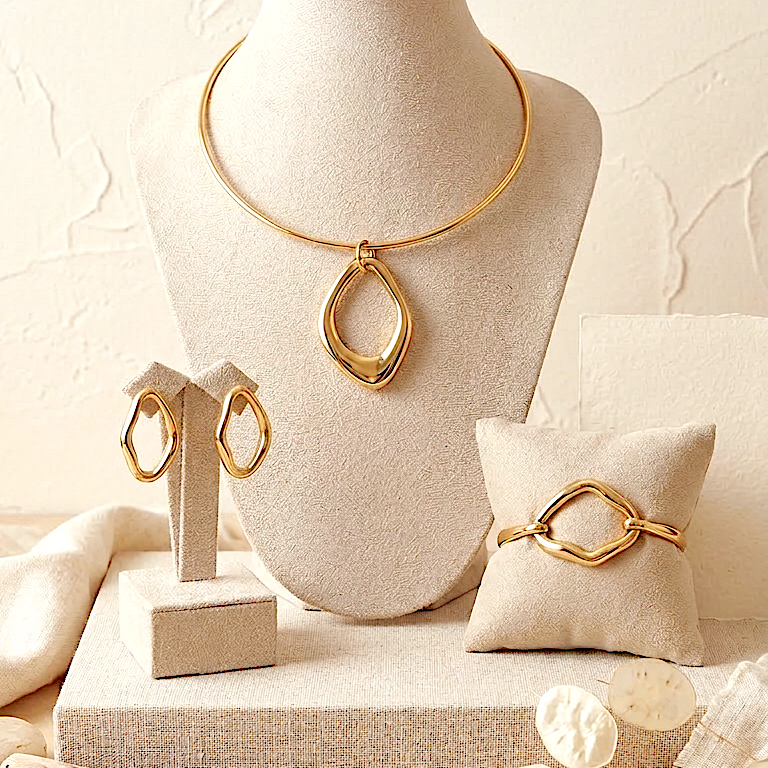Com um design fluido e contemporâneo, o Kit Orleans Orgânico — composto por choker, bracelet e brincos — traz a beleza das formas naturais em uma versão sofisticada e minimalista. Sem pedrarias, seu charme está nos contornos suaves e no acabamento impecável que refletem luz com delicadeza e autenticidade.