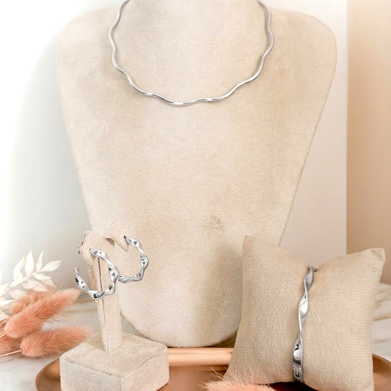 O Kit Wave — composto por choker, argolas e bracelet — traz a beleza das formas onduladas em um design moderno e elegante. Inspirado no movimento das ondas, é perfeito para quem busca um visual leve, sofisticado e cheio de personalidade.