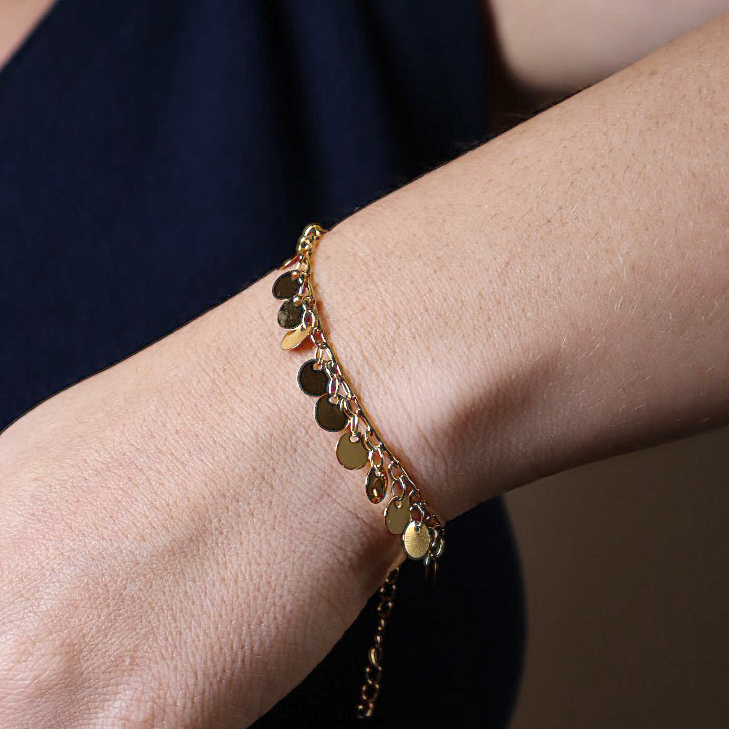 A Pulseira Drops é puro charme e feminilidade. Composta por pequenas medalhas delicadamente suspensas, ela cria um efeito leve e sofisticado que acompanha seus movimentos com brilho sutil e elegante.