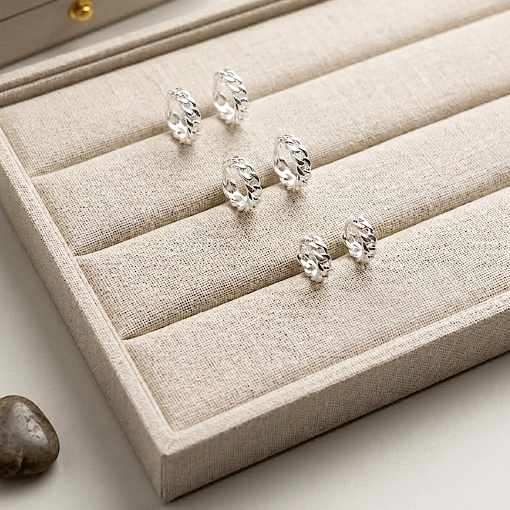 Moderno, estiloso e cheio de personalidade, o Trio de Argolas Correntaria é perfeito para quem ama composições marcantes e atuais. Inspirado no visual das correntes, ele traz textura e movimento para o look, criando um efeito sofisticado e contemporâneo.